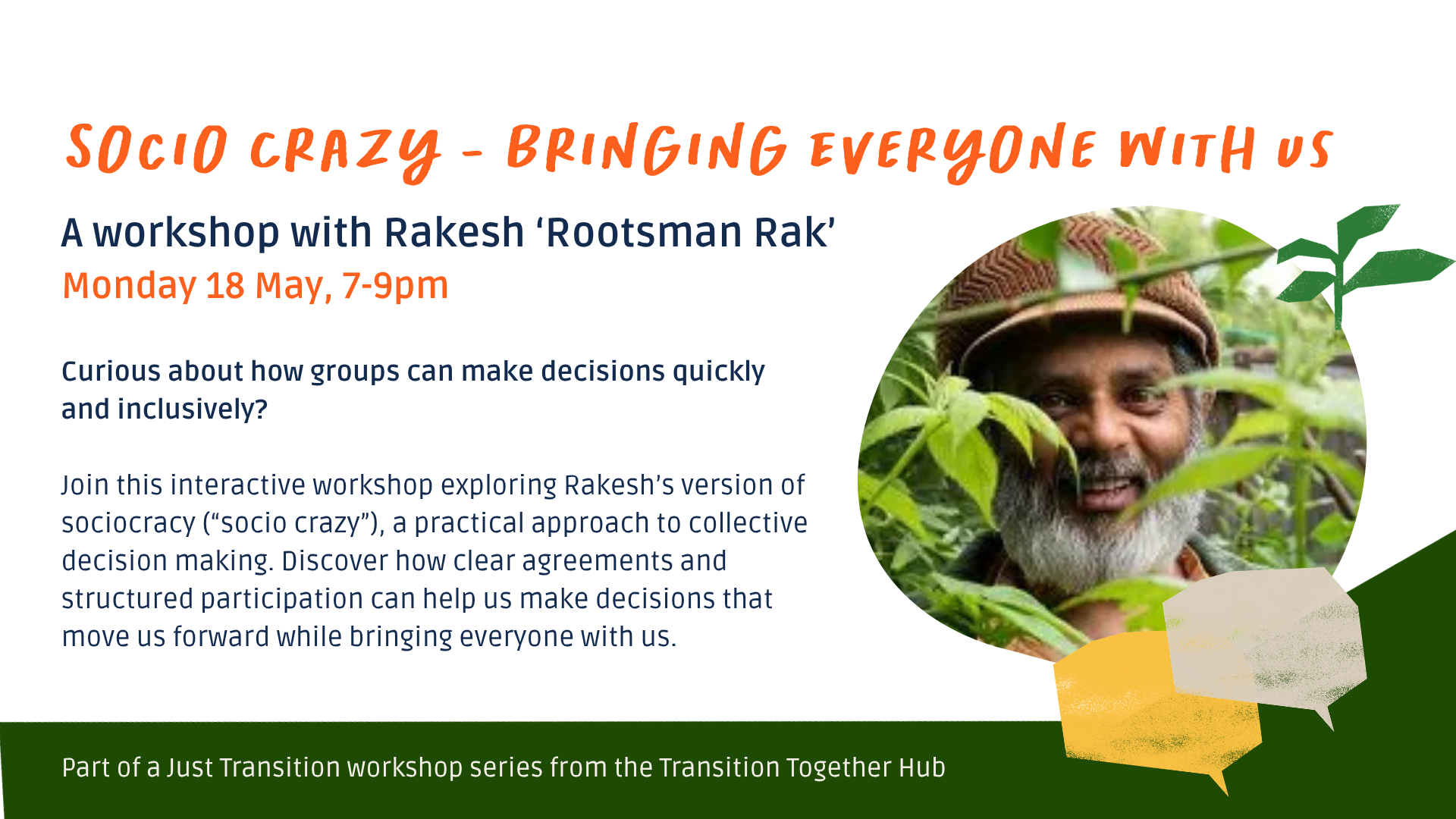 Join this interactive workshop exploring Rakesh’s version of sociocracy (affectionately called “socio crazy”), a practical approach to collective decision making that shows how we can move forward efficiently if we know how to work together.