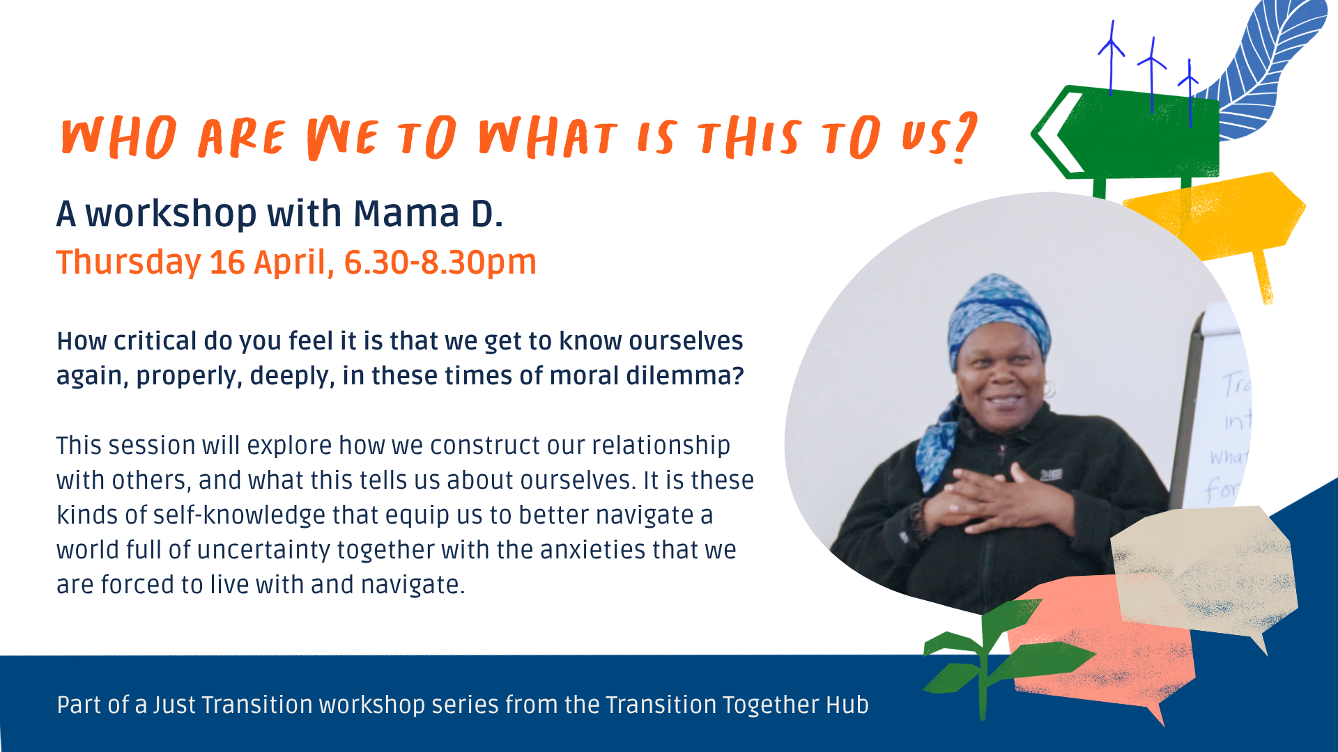We have to be able to begin to re-examine who we are in the midst of uncertainty and the need to re-examine our values – which have been taken for granted. Yet, what is the impact of all of this on our relationships, with ourselves, each other and our communities and ecologies? How critical do you feel it is that we get to know ourselves again, properly, deeply, in these times of critical moral dilemma? Explore these questions and more with Mama D in this participatory and reflective workshop.